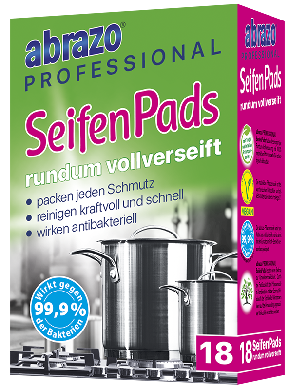 abrazo PROFESSIONAL SeifenPads sind handliche Reinigungskissen. Sie sind rundum vollverseift und sofort wirksam. Fett und Angebranntes werden schnell und restlos entfernt. Die reine Pflanzenseife ist frei von tierischen Bestandteilen und Duftstoffen.